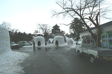 ・横手公園のかまくらを眺めた後、補修作業をしている職員(?)の方々を心の中でそっと応援し、さぁ出発と気合を入れた瞬間、雨が降って来ました。しかし、ここまで来たら止められない。とりあえずスタートです。