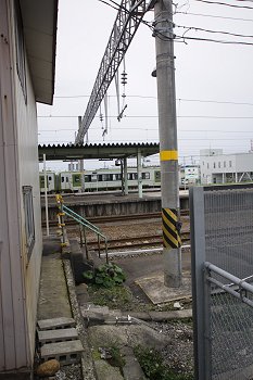 新駅舎の横からホーム近くに移動。金網に隔てられたホームを撮影。そして撤収。