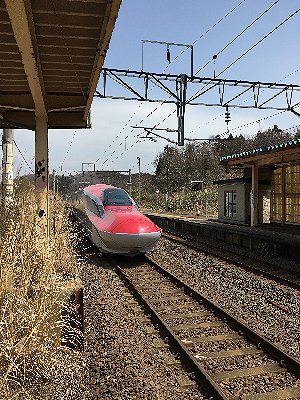 4月初旬:随分と久しぶりの無人駅探訪。ちょうど良いタイミングで真っ赤なアイツが通過しました。奥羽本線大張野駅(秋田市河辺)
