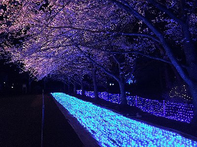 4月下旬: 木戸五郎兵衛村の夜桜ライトアップ。満開の桜に青色電飾とか意味わからんw キレイだったけどwww